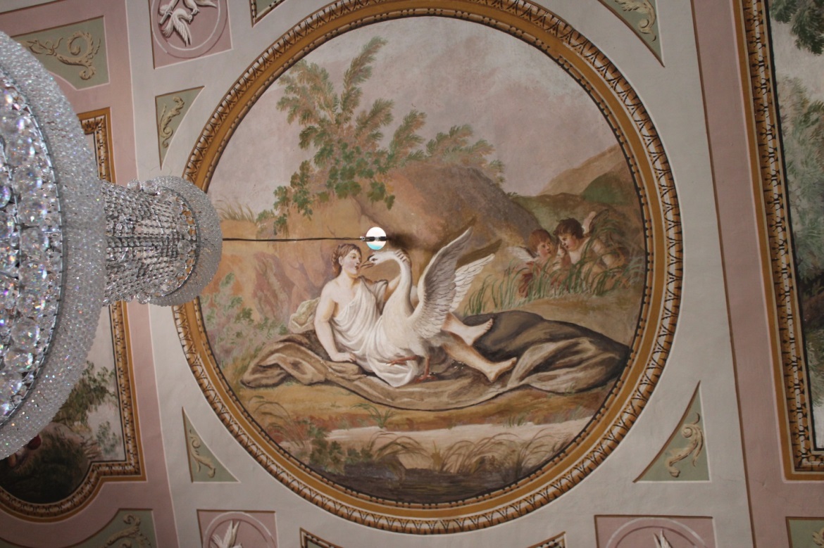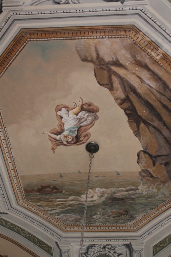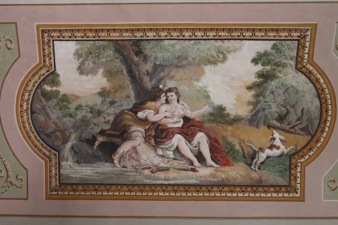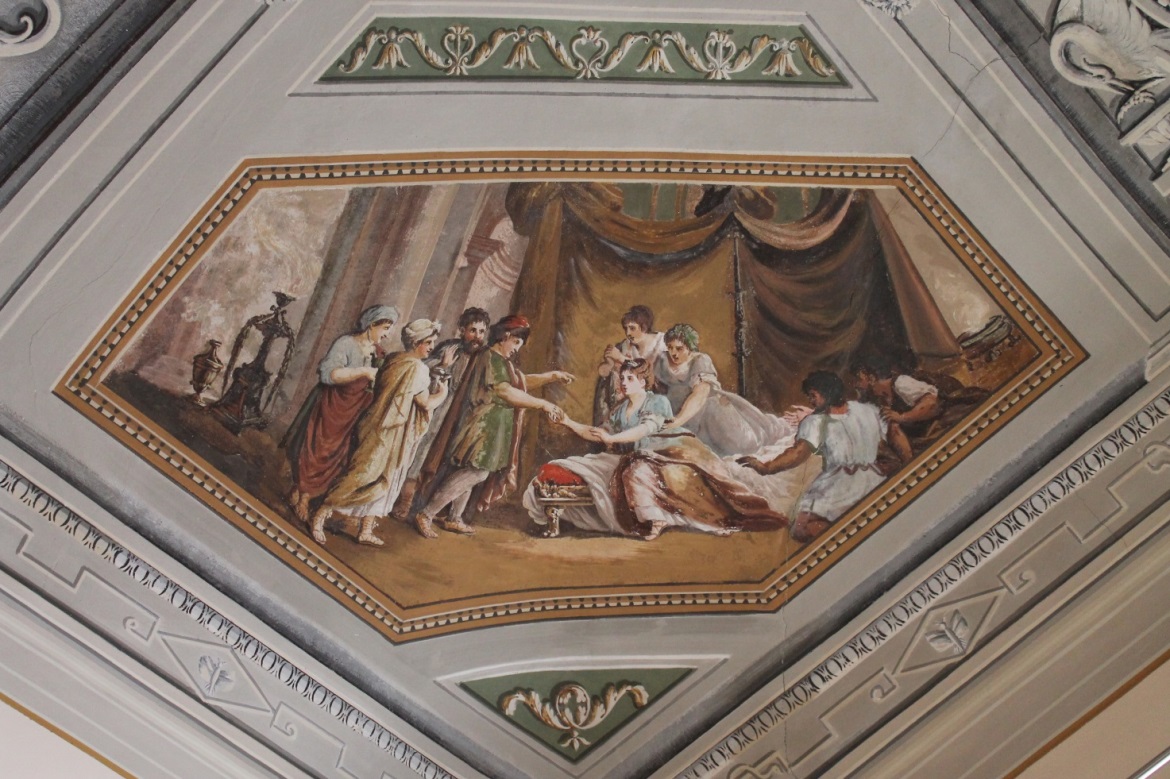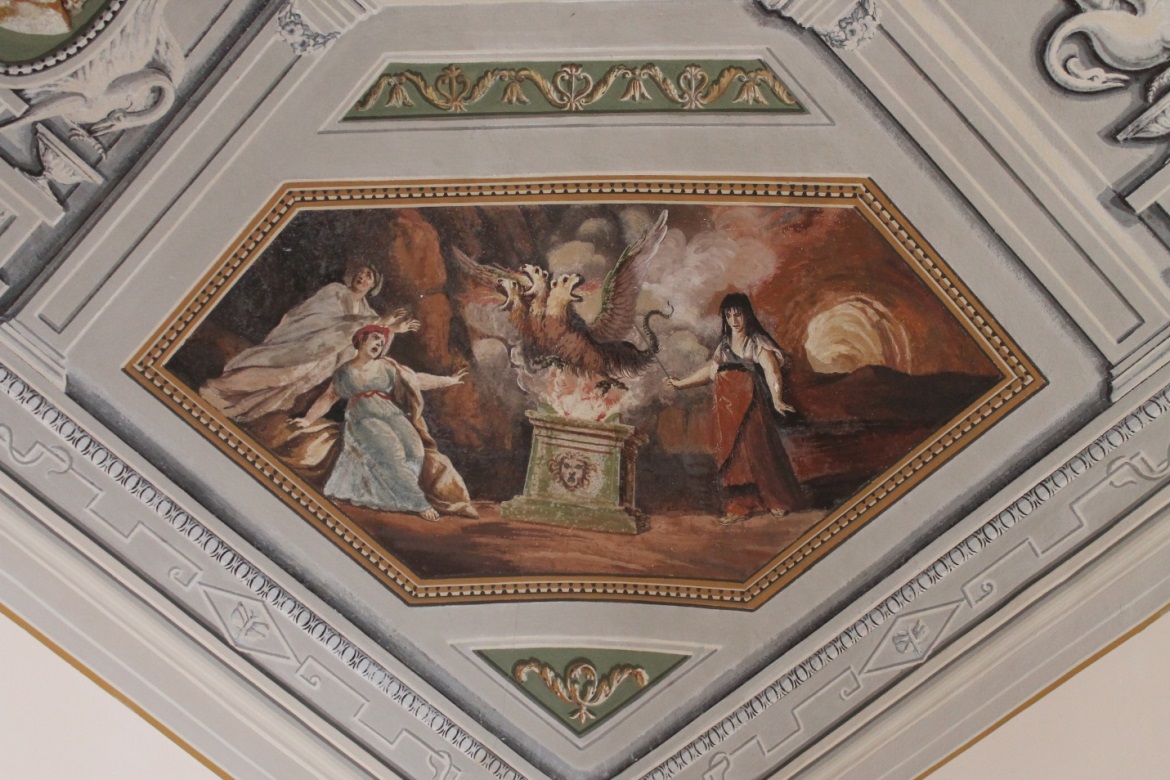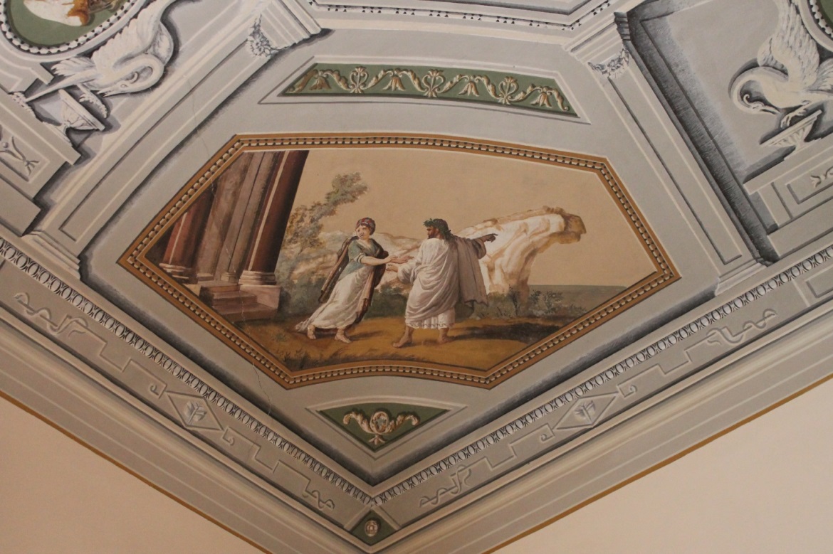 Palazzo Azzolino, which belonged to an important family of Fermo, was restored in 1779. During the first half of the XIXth century, it was then subject to a decorative campaign. The available proof is represented by two rooms only. One room represents Ovidio’s Methamorphosis, the second one Alessandro Verri’s Saffo. Since in both rooms the main theme is love, it’s possible to suppose that they were created because of a marriage. Thanks to an archival research, conducted in the State Archives of Fermo, in the Historical Archiepiscopal Archives of Fermo and in the Azzolino Archives of Jesi, it was possible to figure out two ipothesis about the commissioners. The first refers to Giovan Battista Azzolino, while the second refers to his son Pompeo. They were probably the creators of the iconographical project of the cycle.