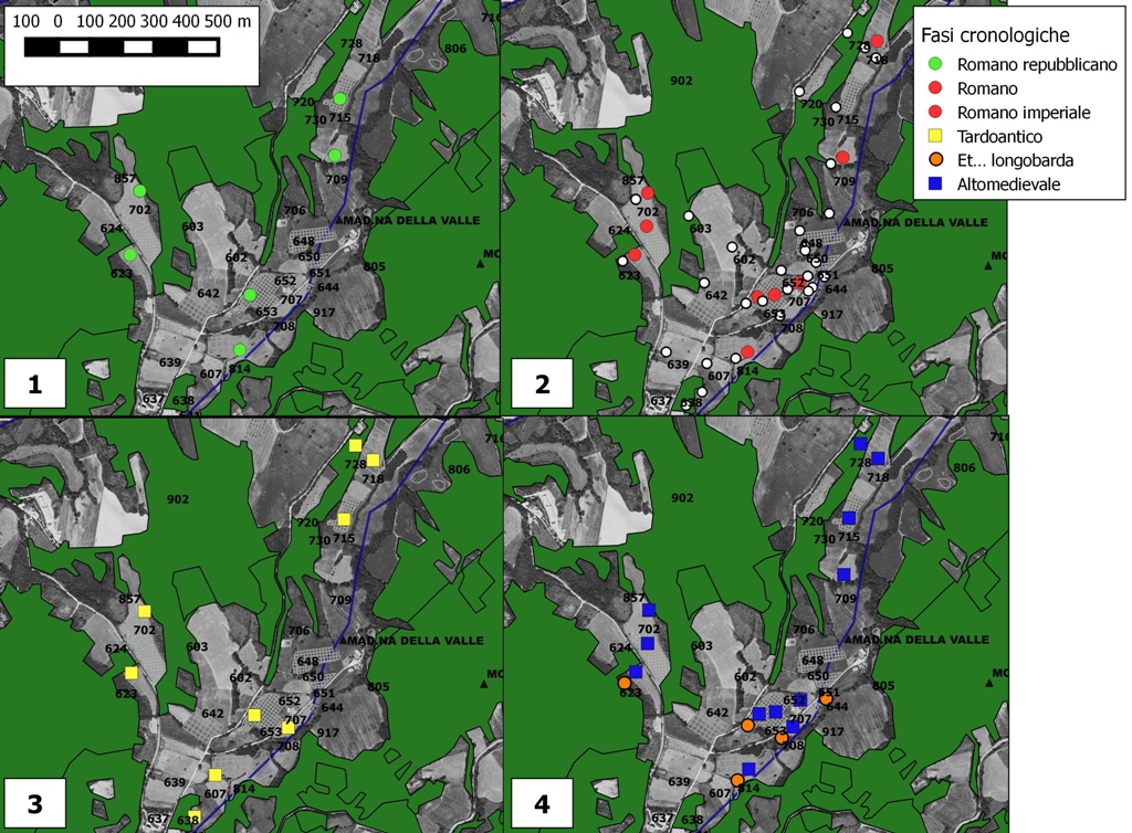 This paper concerns the methodological aspects and some main results of an archaeological survey linked to the R.I.M.E.M. project (Researches on the Medieval Settlement in the Marchean Inland), carried out since 2006 in the inland of the Marche Region. In the first section the Author reports about the hard methodological problems related to the geomorphological features (slope processes, landslides, colluvial deposits), to the vegetation covers, to the heavy pottery fragmentation (due to the mechanized farming) and finally to the lack of knowledge about postclassical ceramics in the Region. The second section concerns both the methodological-technical aspects of the survey, and the interpretation of some main results, principally with regard to the topic of the rural settlement evolution between Late Roman Period and X-XIth centuries.