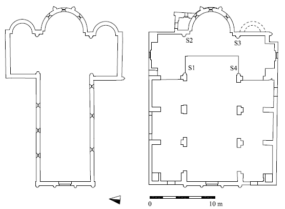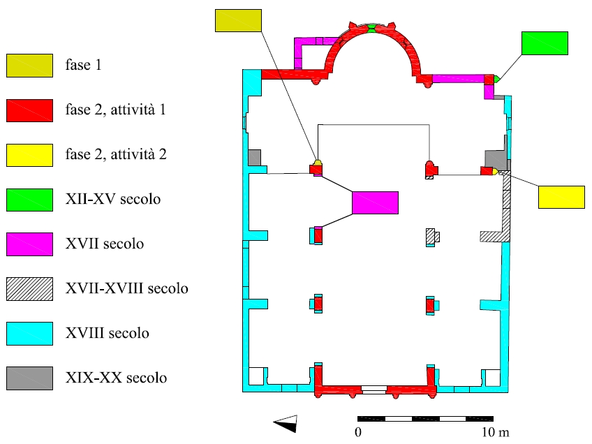 The church of St. Fiorentino in Nuvolato is one of the fi nest examples of Romanesque architecture in the territory of Mantua. Mentioned for the fi rst time in a document dating back to 1059, the Church was rebuilt between the eleventh and twelth centuries. Originally planned with a single nave, it was then turned into a three nave Church and covered with Baroque decorative elements in the seventeenth and eighteenth centuries. After a careful restoration in 1975 the Romanesque style resurfaced. Through the study of the elevate structures, archaeologists tried to reconstruct the exact physiognomy of the Romanesque church, the presence of any other existing building and the different phases of construction which led to fi nal Baroque modifi cations. As regards the Romanesque phase, stratigraphic analysis identifi ed the changes made during construction as well as errors in the building process, which seem to have been based on a general plan and perhaps without the contribution of a professional in charge of standardizing the building techniques.