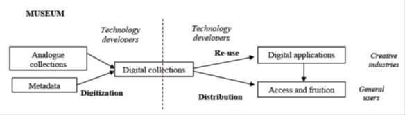 Recently, digitization has attracted increasing interest not only in museology and computer science, but also in economics and managerial literature. Scholars have tried to analyse how technological innovation is reshaping the role and mission of museums as producers and distributors of cultural content and investigate the new business model that emerges. The present work aims to investigate the adoption of ICT and innovation processes in museums, and their interaction dynamics between curators and technology developers. We analyse an Italian successful museum case study, the Uffizi Gallery in Florence, where digitization has been developed through a long-term partnership among the local University, a creative ICT enterprise and other technical partners. Data collection integrates some semi-structured interviews with information from websites, documents, publications, and the museum’s institutional communication. The main results show that this case can be defined as a Virtual Value Chain Model according to a curatorial approach at European level.