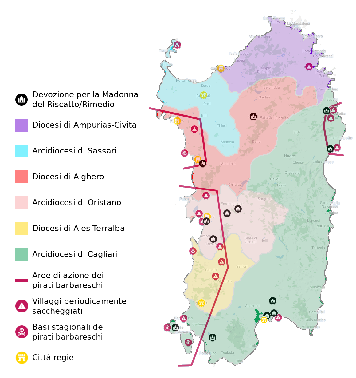 The purpose of this essay is to investigate the impact of the Marian cults specialized against the Muslim threat in Sardinia in the 16th-17th centuries by analyzing the relative Marian iconographies. Specifically we intend to study the processes of reception and diffusion of the devotions sponsored by the mendicant orders of the Trinitarians (Our Lady of Ransom, Our Lady of Good Remedy), of the Mercedarians (Our Lady of Mercy, Our Lady of Bonaria) and in particular of the Augustinians (Virgin Hodegetria), which played a key role in the development of a new iconography with underlying messages of redemption, conversion and reconversion. In the investigation, the political, social and devotional context of reference is taken into account, data are gleaned from archival and literary sources and particular attention is paid to the use of images in their dual expression through sculptural production and literary description.