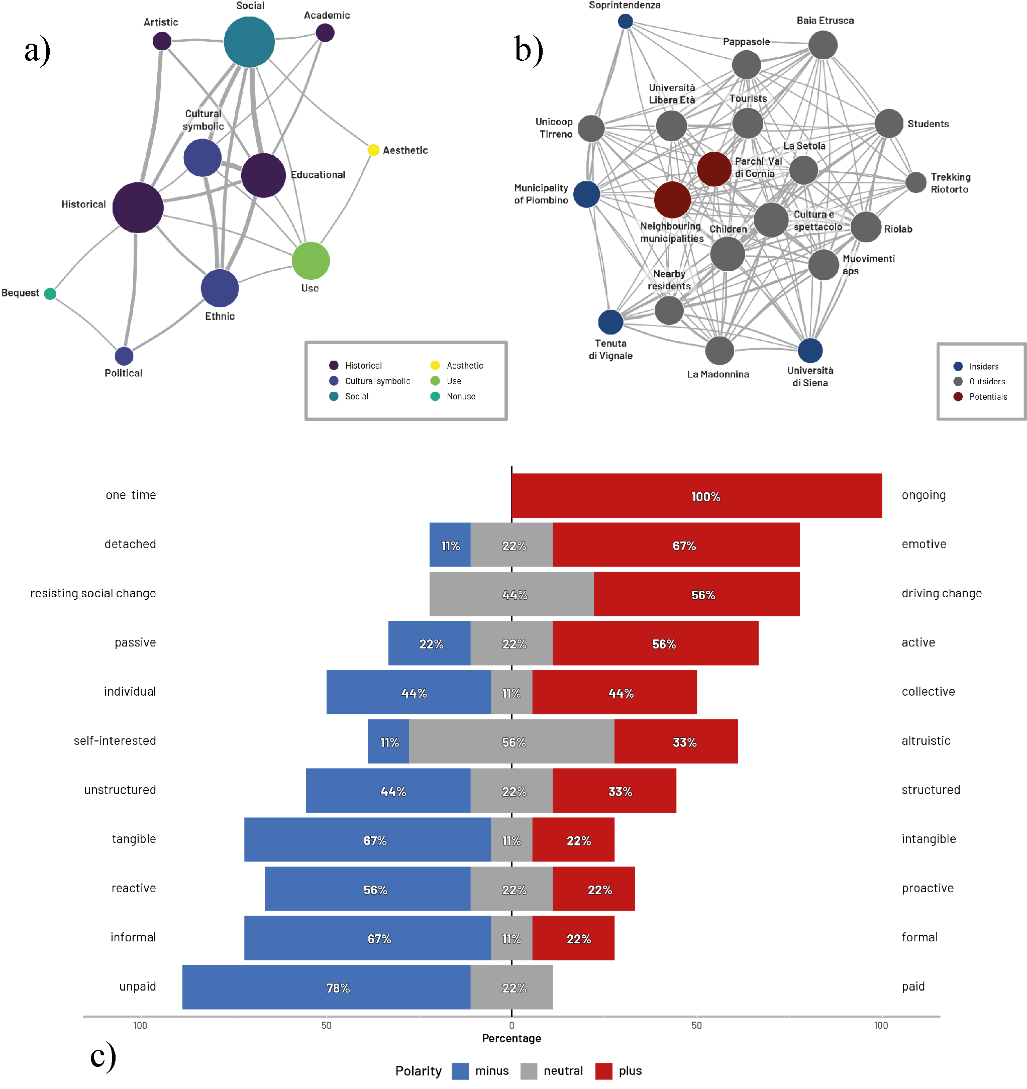 - a) social network analysis (SNA), con i valori come nodi; b) social network analysis (SNA), con i valori come stakeholders; c) participation polarised chart (PPC)