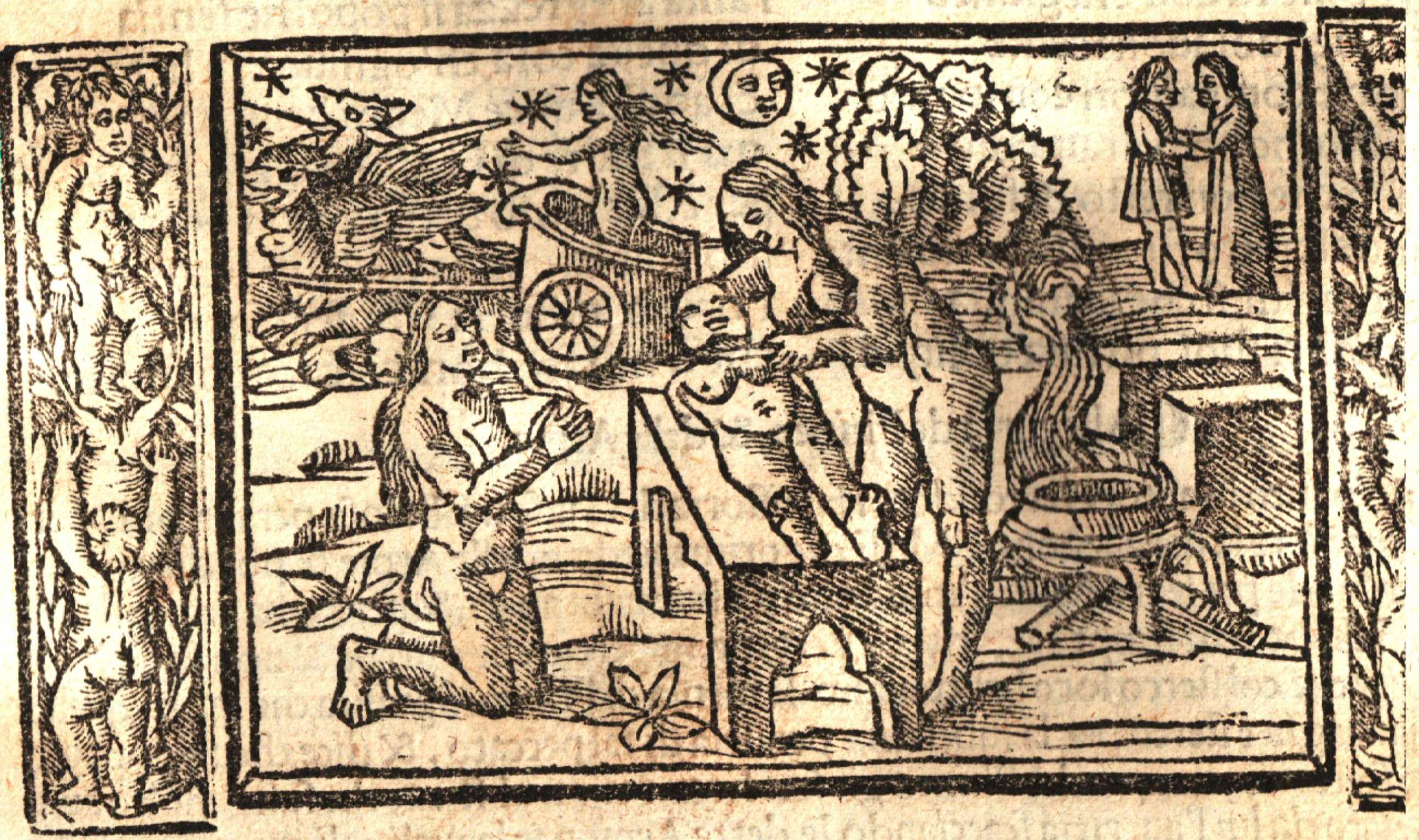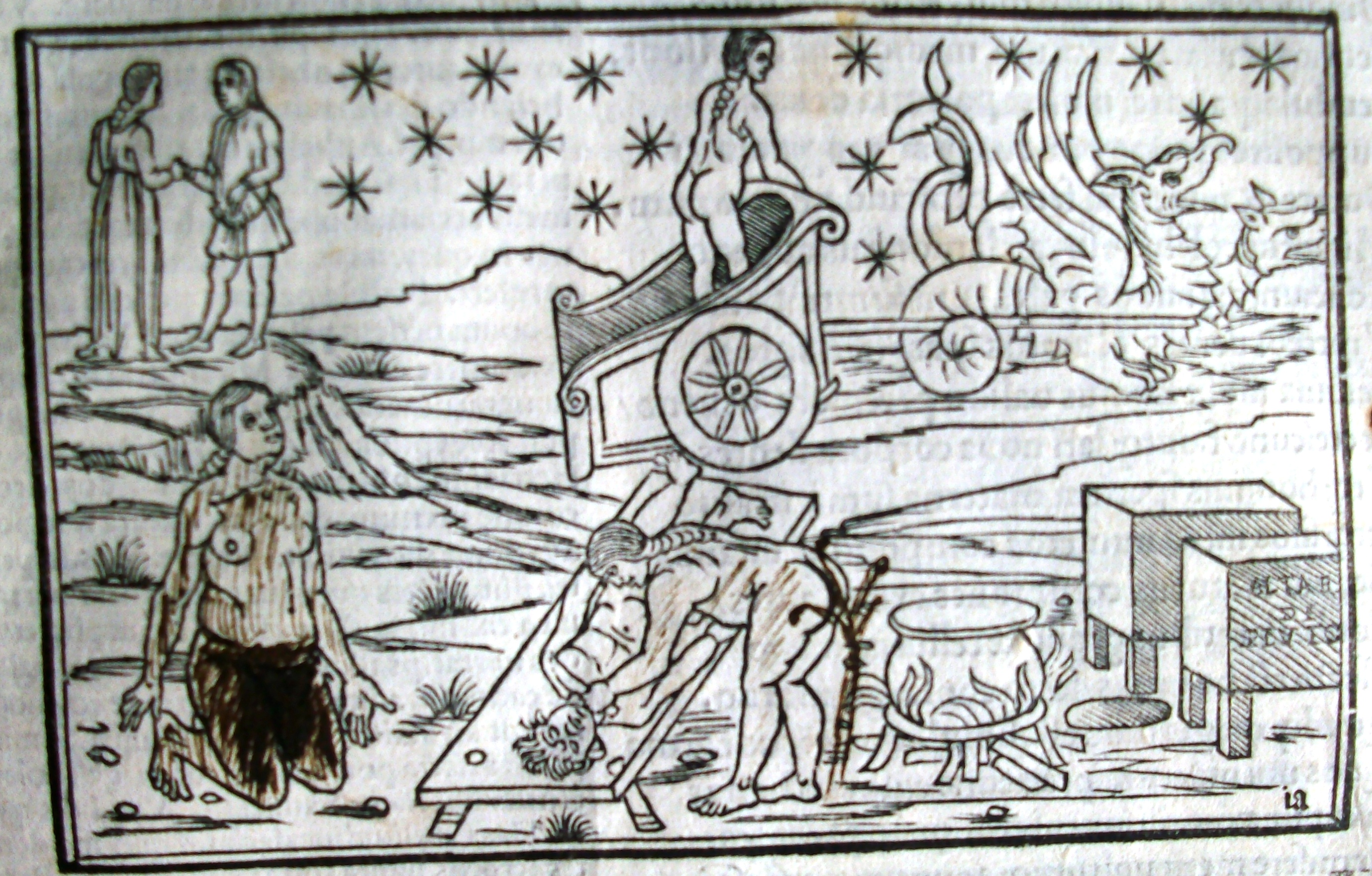 Even though after the famous tragedy of Euripides literary and iconographic sources represent Medea mainly as infanticide mother, the Medea of the Ovid’s Metamorphoses is above all a powerful sorceress: a wise expert of grasses, by which she prepares effective magic potions, and a skilled manipulator of prodigious recipes, that she activates thanks to the help of hellish divinities, invoked with vocal formulas in her nighttime rites. In the same way, in the woodcuts that decorate the Renaissance editions of the Metamorphoses, particularly in those of Giovanni Antonio Rusconi for the Lodovico Dolce’s Trasformationi, Medea is represented above all as a good-looking sorceress, that executes her sorceries for love or for revenge. Especially in the woodcut with The rejuvenation of Esone, Rusconi combines the characteristics of the Renaissance sorceress with those of the Northern witch: Medea is still an attractive and young woman, but she carry out, by now, magic operations comparable to the witchcraft.