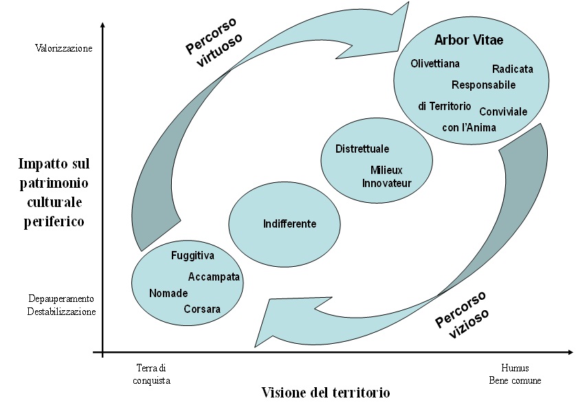 In the era of globalization, are there are companies that enhance the peripheral cultural heritage? Which ones? What is their business model? What are their key organizational processes? With the aim to answer these questions, we first carried out a desk survey on the basis of which, according to the proxies “longevity” and “territorial roots”, we selected three Italian companies operating in three different traditional manufacturing sectors. Field research has led to map the core organizational processes through which the selected companies give voice and visibility to the uniqueness of the cultural heritage in which they are embedded. Starting from the empirical evidence, we developed an ideal-typical firm model metaphorically called arbor vitae. In a dialectic frame between deduction and induction, the model offers policy makers a tool to identify and encourage firm behaviors oriented to the enhancement of peripheral cultural heritage and also to the business decision makers an original theoretical framework to strategically interpret the hologramatic relationship firm-territory.