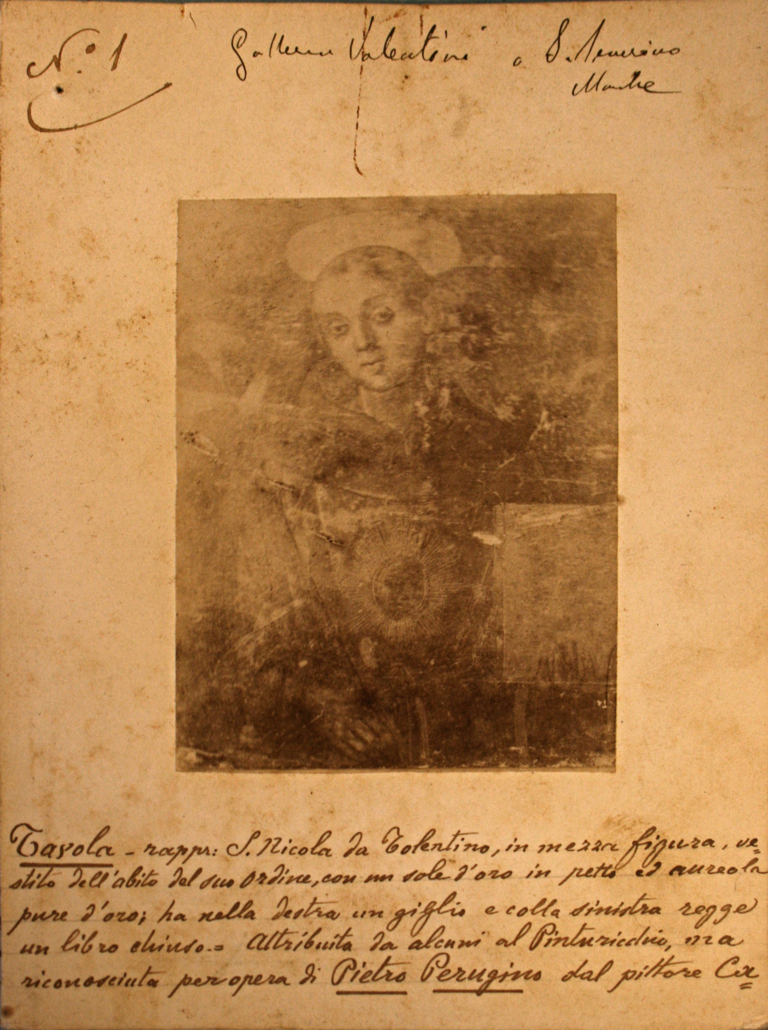 - Fig. 1 Scuola di Pietro Perugino, (attr. ottocentesca a Pietro Perugino), San Nicola da Tolentino, tempera su tavola, 47*38 cm, già a San Severino Marche, collezione Valentini, Perugia, Galleria Nazionale dell'Umbria.