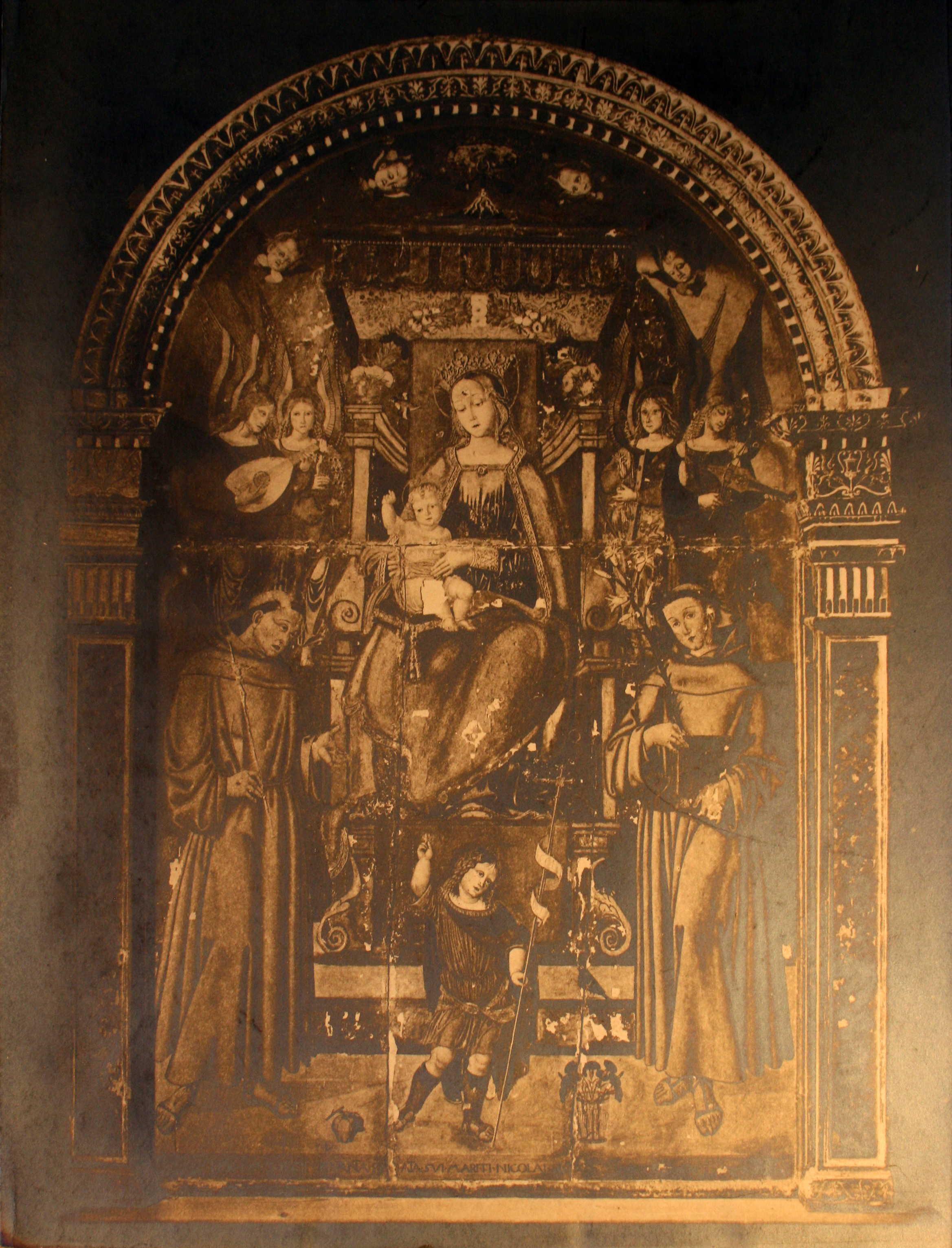 - Figura 12 Bernardino di Mariotto, Madonna col Bambino, San Francesco, san Giovannino, Sant'Antonio da Padova, angeli musicanti e cherubini, 1506 circa, tempera su tavola, 250*147 cm, Potenza Picena, Pinacoteca Civica, immagine fotografica agli anni agli a