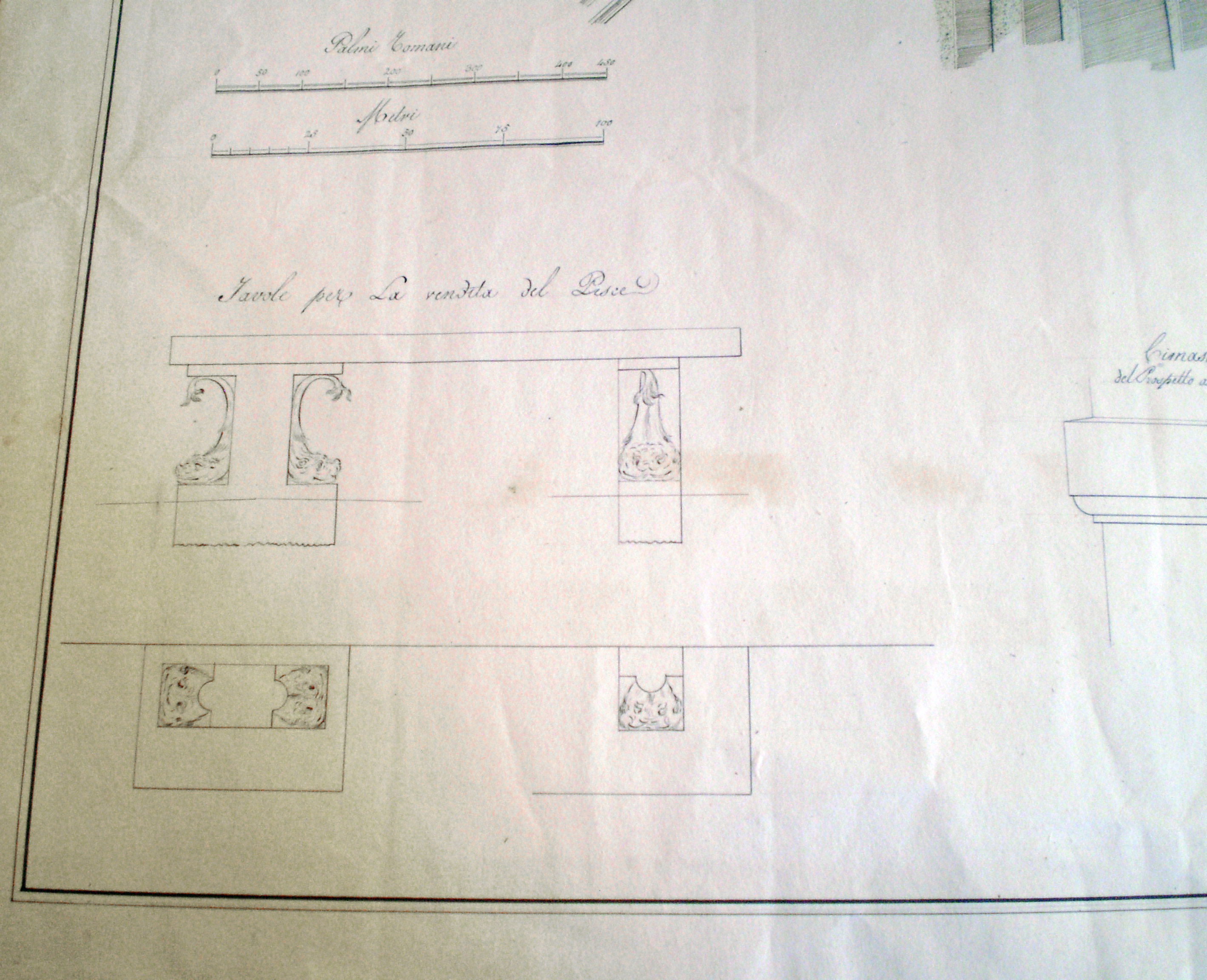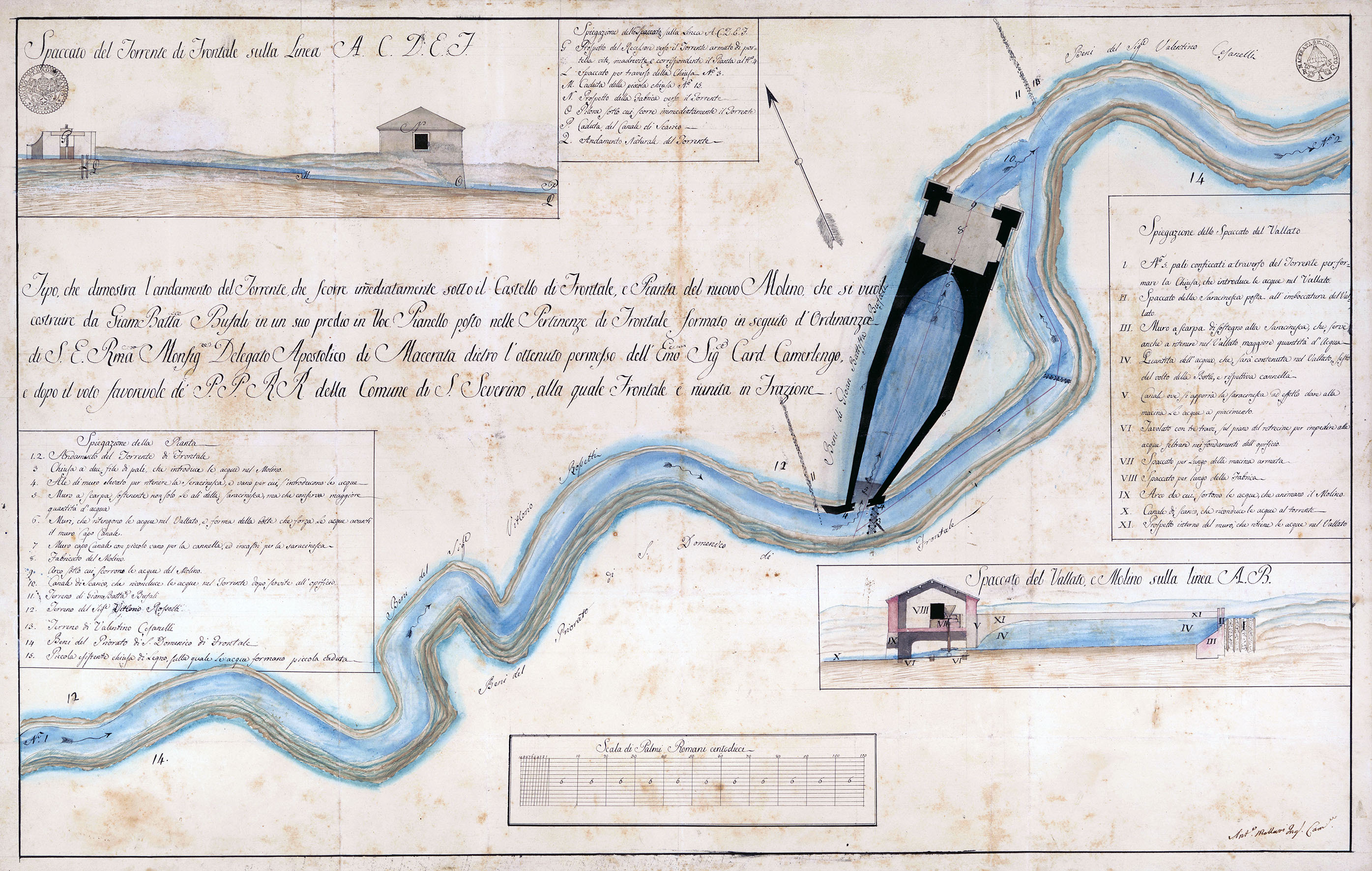 From 1818 to 1820 Mollari is head Engineer of the Pesaro/Urbino Delegation, engaged in the canal harbours of Fano, Pesaro and Senigallia. After having analyzed some important 17th and 18th century projects plus those of the French era for these three districts, he realizes that from 1819 Angelo Pistocchi’s drawings are the best and those that suit the case. Mollari’s “work plan” between Pistocchi and his “deputy” Giuseppe Costantini proceed up until 1825 in Pesaro; whereas in Senigallia, Mollari’s urban map shows the route taken by the canal harbour in the heart of the city. The major part of the documents, signed by Mollari, are accompanied by his own statements, by those of Brandolini the inspector, by the Art Council’s members, by the Treasurer and the Camerlengo: among these the autographed ones stand out for the Senigallia Port and for the Stream running under the Frontal Castle, where a mill will be built, to be done at the beginning of the Pesaro mandate.